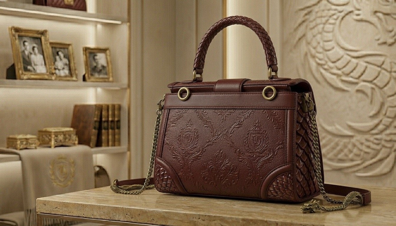 • Hardware de Realeza: Os suportes das alças apresentam esculturas de Cabeças de Leão em metal banhado a ouro, simbolizando força e autoridade.